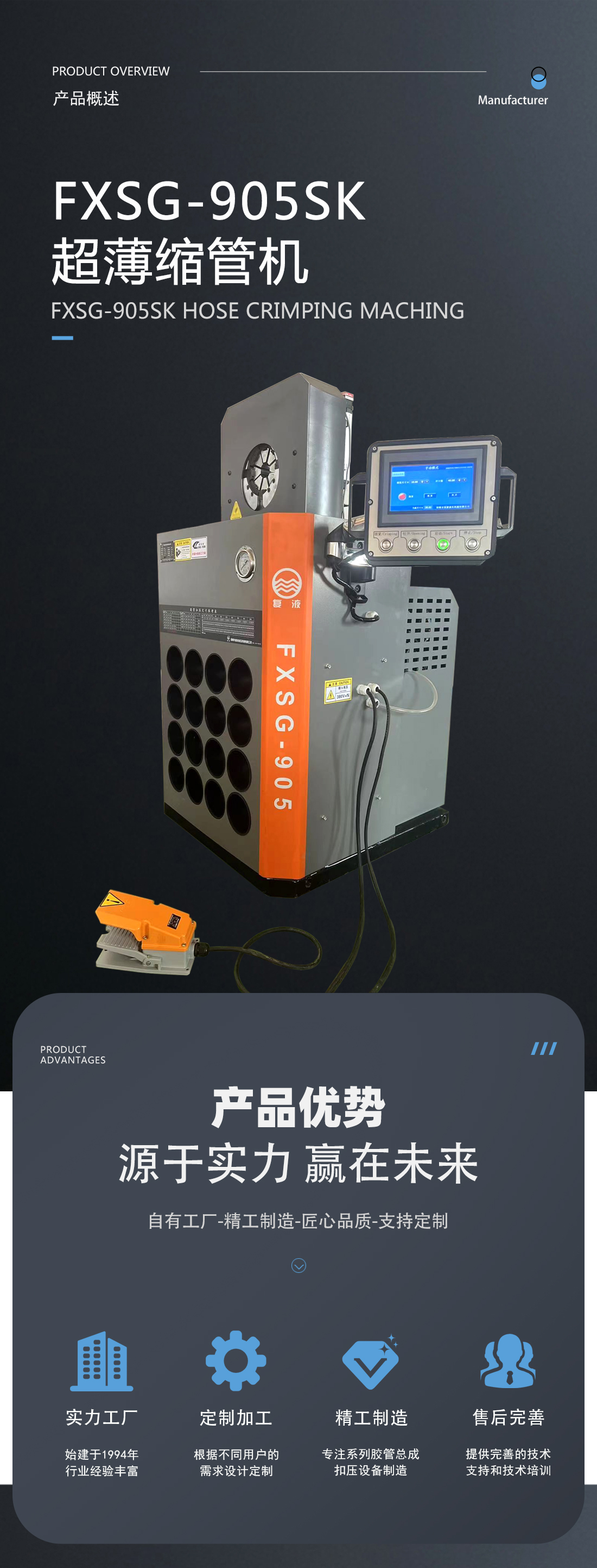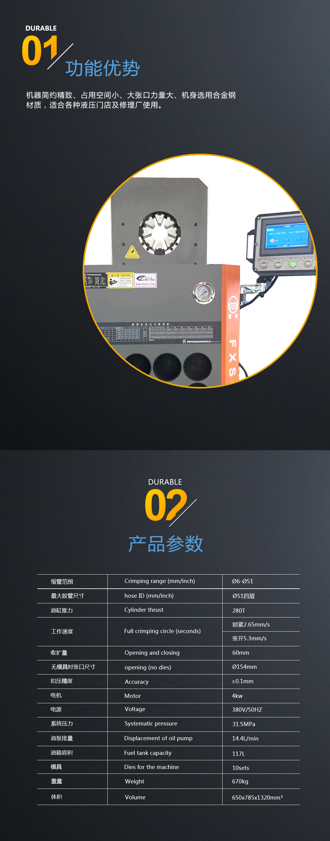 我公司新研發成功了超薄系列縮管機,扣壓重復精度可達到0.1mm。超薄的結構形式克服了傳統環形扣壓機固有的不足,能夠非常方便的扣壓形狀復雜的高壓油管總成和異型軟軸軟管。此款機器外觀尺寸更小,采用人性化設計,更方便使用者操作。控制系統采用的是PLC+觸摸屏模式,位移傳感器采集信號精度高,系統可采用手動、半自動和全自動三種模式,用戶可根據實際加工的工況非常方便的進行選擇,從而大大提高加工效率。在您使用的過程中如遇到有不方便之處請及時與我們聯系,我們將以不懈的努力提高您的產品質量和工作效率。